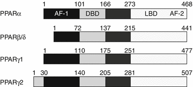 The PPAR receptor family. Human PPARs share a common modular structure typical for the nuclear receptor superfamily. The highly conserved central DNA-binding domain (DBD) contains two variant zinc fingers. By each of them, one zinc ion is bound by a tetrahedral arrangement of cysteine ligands. The C-terminal ligand-binding domain (LBD) and the ligand-independent and ligand-dependent activation domains (AF-1 and AF-2, respectively) are less conserved and confer transcription regulation via their interaction with coactivator and corepressor complexes. Amino acid numbers are indicated for each receptor isoform