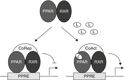 Transcriptional activity of PPAR-RXR heterodimers. Left, in the unliganded state, PPAR-RXR heterodimers bind to PPREs in the promoter region of target genes and inhibit their transcription by recruiting corepressors (Co-Rep). Right, upon ligand (L) binding, corepressors are released and coactivators (Co-Act) such as p300/CBP are recruited to cooperatively activate transcription of PPAR target genes