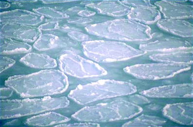 Pancake ice is a form of ice that consists of round pieces of ice with diameters ranging from 30 cm to 3 m, depending on the local conditions that affect ice formation. It may have upto 10 m thickness. Pancake ice features elevated rims with a nearly uniform height of a few centimeters. These rims are the first indication of the onset of the formation of the pancake ice from less consolidated forms of ice.