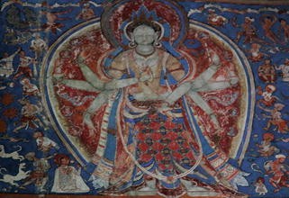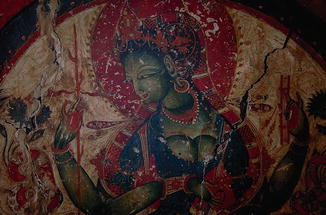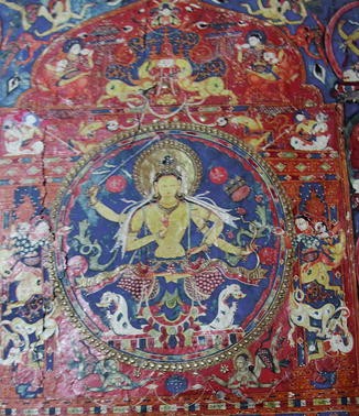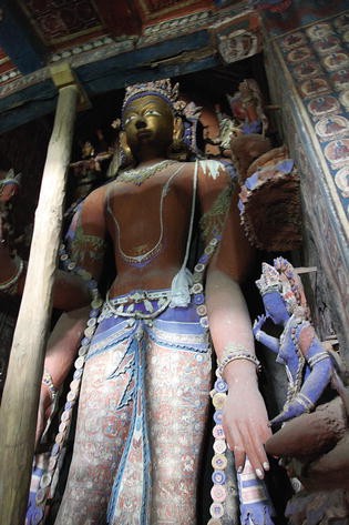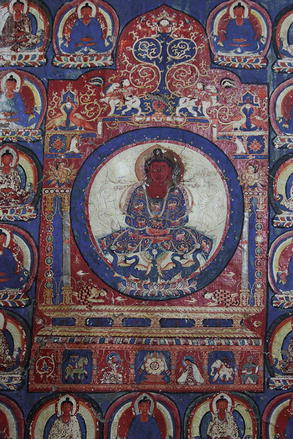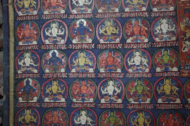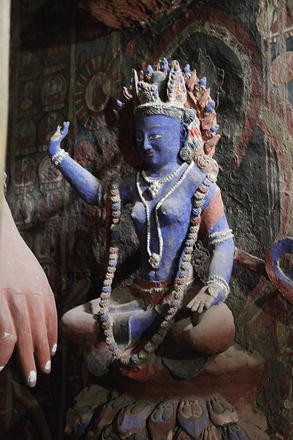 The Dukhang is the largest structure and is at the heart of the monastic complex. Though many additions were made to the ancient structure during the twelfth and thirteenth centuries, the original wooden door frame is retained. The hall can be approached through the colonnaded veranda from a front courtyard. Frescoes of one thousand buddhas are portrayed in the walkway. The Wheel of Life and Mahākala are depicted at the outer gate. The walls of the Dukhang are painted with six different maṇḍalas that surround the four-headed Vairocana, the main deity worshipped in the hall. Vairocana is flanked by four goddesses and a number of offering deities in clay.