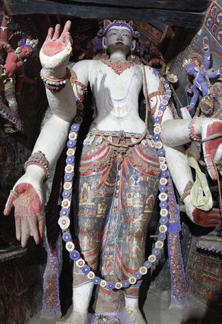 Alchi, a Buddhist monastic complex (chos-’khor), is located on the left bank of the Indus River at an altitude of 3,100 m and at a distance of 65 km to the west of Leh in Ladakh. The monastery (gompa) has three major shrines and two chörtens: the Dukhang (Main Temple), the Sumtsek (Three-Storey Temple), the Jampel Lhakhang (Temple of Mañjuśrī), the Great Chörten, and the Small Chörten – all belonging to the period from the middle of the twelfth century to the first quarter of the thirteenth century. Other than these, the Alchi complex also has two other important temples, viz., the Lotsabha Lhakhang (the Translator’s Temple) and the Lhakhang Soma (New Temple). These two temples are later additions. In addition, the towerlike structures flanking the Dukhang belong to an early phase of the gompa. The Alchi complex houses some of the most fascinating images and paintings of Buddhist art in the Himalayas which are considered as of “unique style and workmanship.” The entire gompa is in a rather dilapidated condition except for the pillars and the wood carvings on the doors.